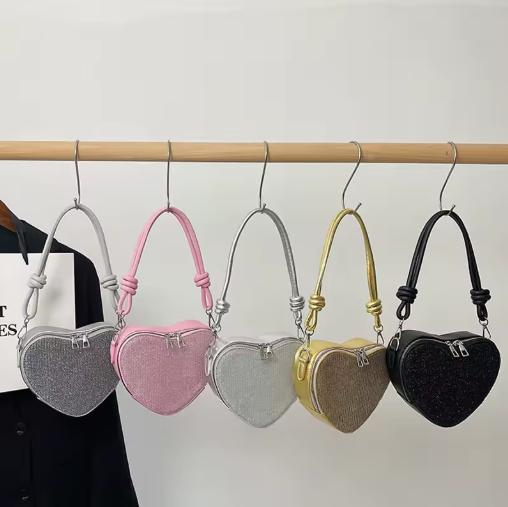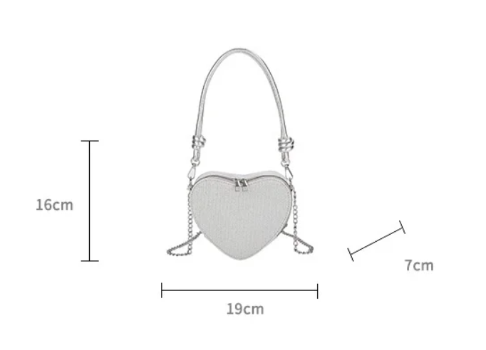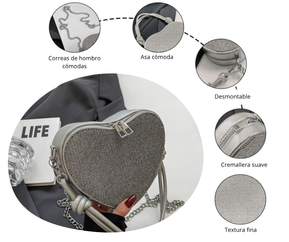 Agrega un toque de brillo y sofisticación a tu look con el bolso de corazón. Este bolso de mujer combina un diseño moderno con detalles relucientes, ideal para salidas nocturnas, eventos especiales o simplemente para darle un plus glamoroso a tu día a día.